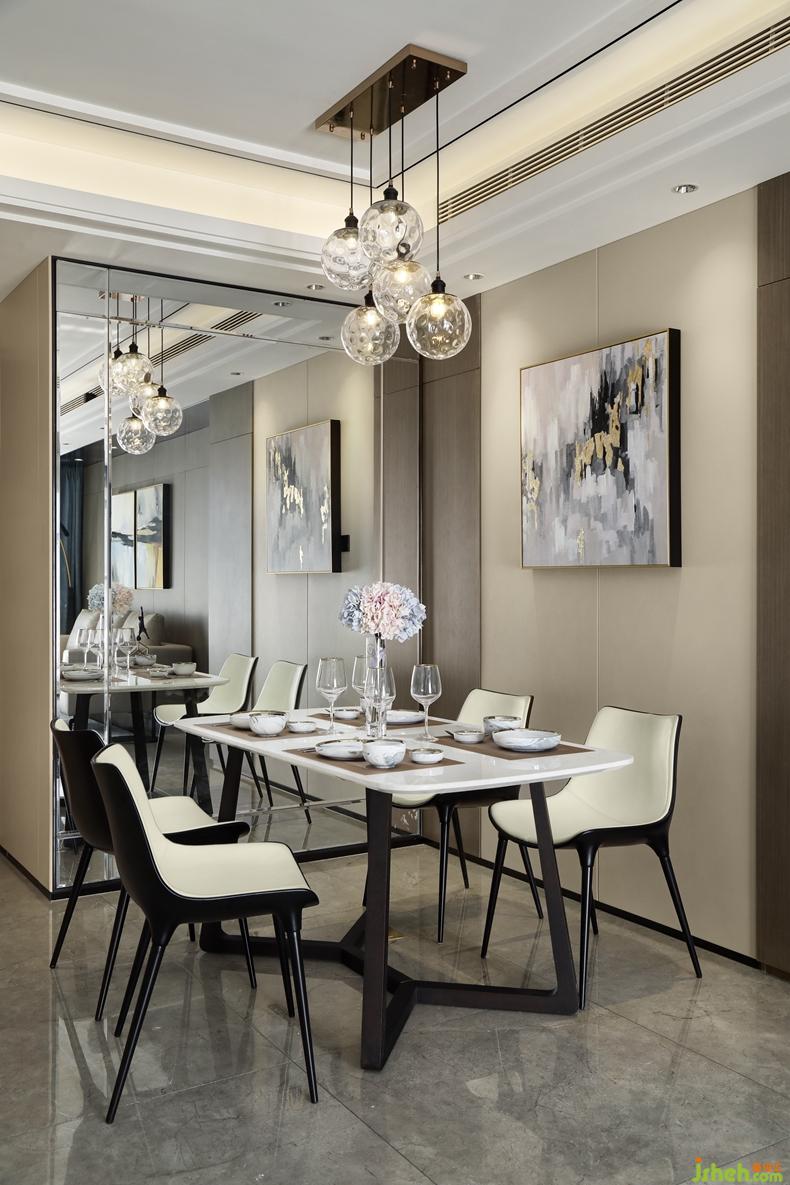 餐廳一角的設(shè)計,采用了整體鏡面處理的墻面,透過折射的視線使整個空間展現(xiàn)得寬敞、明亮。水晶燈下雪花白的簡易幾何餐桌,室內(nèi)設(shè)計師搭配一側(cè)優(yōu)雅的掛畫,體現(xiàn)著主人家對生活的精致追求。