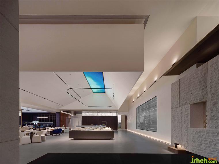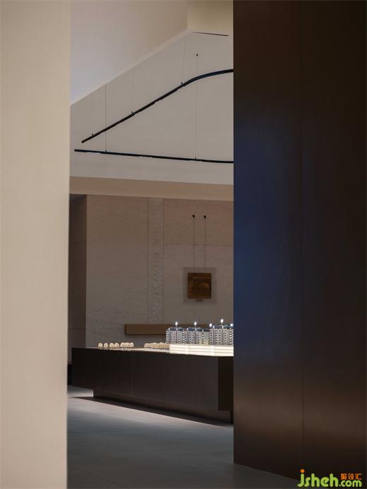 沙盤區(qū)頂部采用茅屋的梯形結(jié)構(gòu),模擬鏤空效果,體現(xiàn)出傳統(tǒng)建筑的美學(xué)特點,讓空間結(jié)構(gòu)看起來更加輕盈和自由。銷售中心設(shè)計垂落的燈帶豐富空間的層次感,不再局限于傳統(tǒng)售樓處的展示模式,而是以一種更為靈活且富有創(chuàng)意的方式呈現(xiàn)。