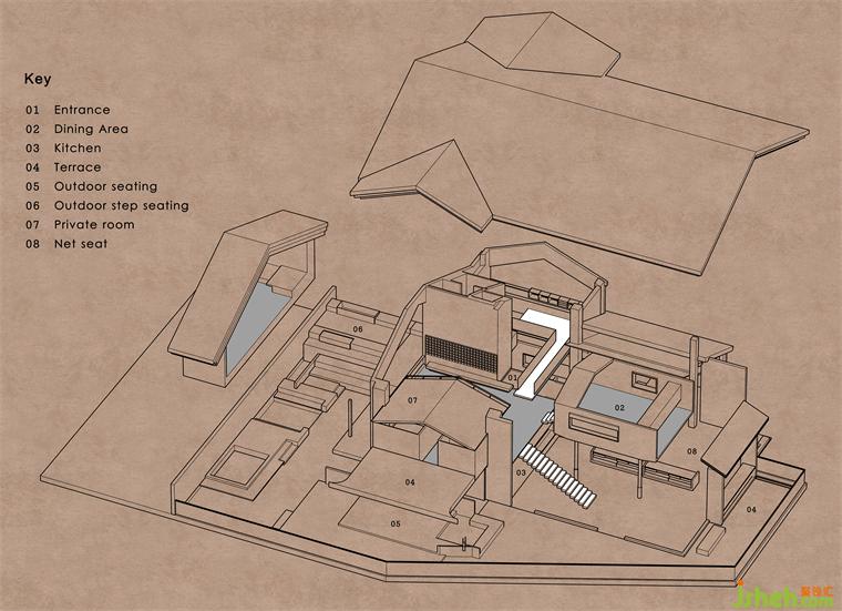 迭代設計展現(xiàn)了社區(qū)關系錯位的變形,以空間幾何為前提,街巷尺度和院落關系引導了設計進一步的發(fā)展。這種設計思路轉化為平面的表現(xiàn),體現(xiàn)為一系列院落、室內、走廊的變形。餐廳設計多邊形幾何體系構成了內建筑的尺度系統(tǒng),而步道則將戶外空間的室內、階梯和轉角連接起來,豐富了其空間效果,與社交性相得益彰。