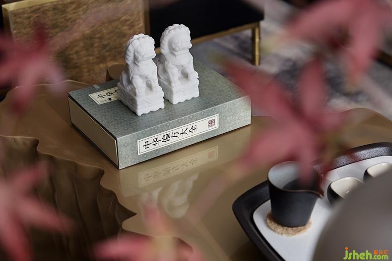 三層的主臥繼續(xù)貫穿整個(gè)格調(diào),背景墻是日本知名畫家的金箔畫,貴氣十足。橫擴(kuò)捫皮床屏圓弧倒角處理,融入包裹感和當(dāng)代功能性,用摩登手法和材質(zhì)演繹當(dāng)代中式韻味。臺(tái)燈的造型取意于太湖石,別具一格。云紋夾絲玻璃隔斷與金屬網(wǎng)狀吊燈遙相呼應(yīng)。臥室的步入式衣帽間——通透夾絲玻璃門,從而讓整個(gè)衣帽間變得通透、輕盈,在這里,衣帽間不再是乏味地吊掛著服飾,同時(shí)也是主人收藏藝術(shù)品與生活品味的角落。
