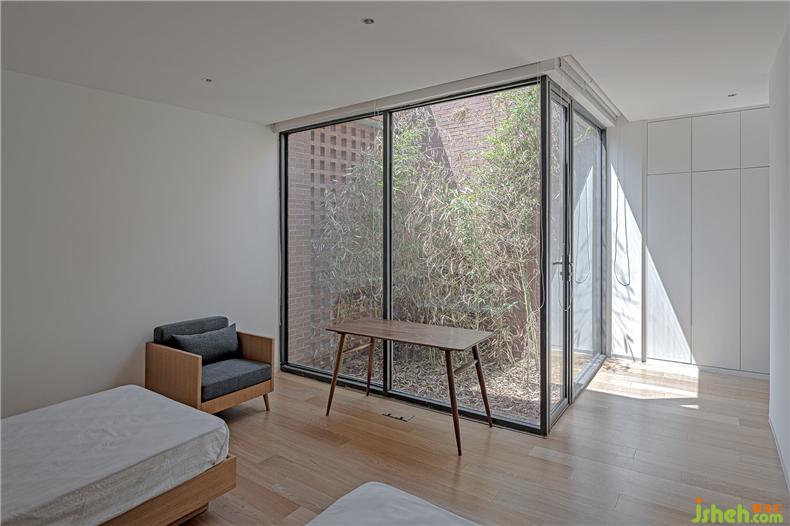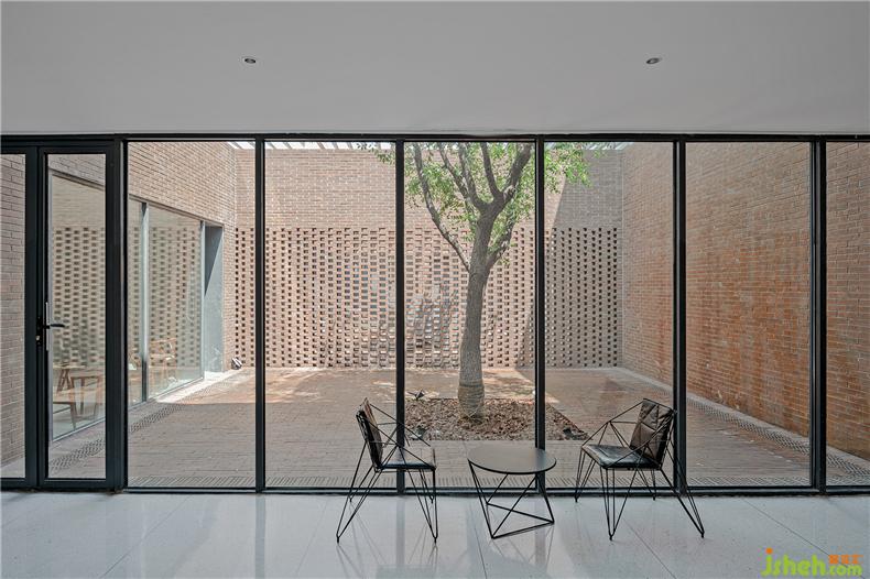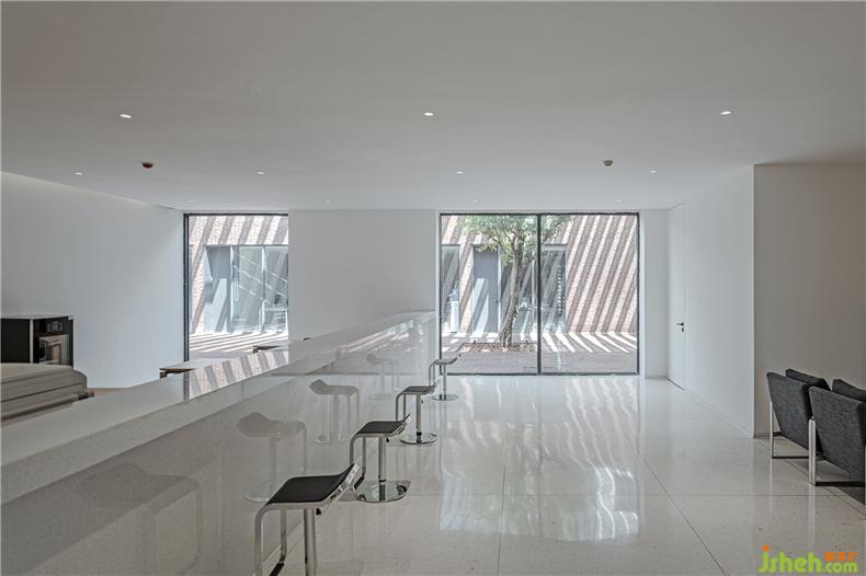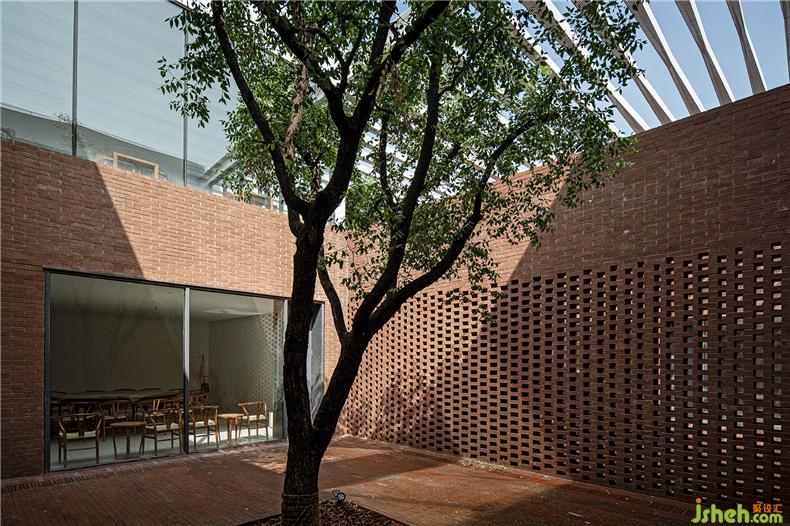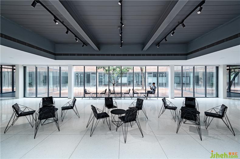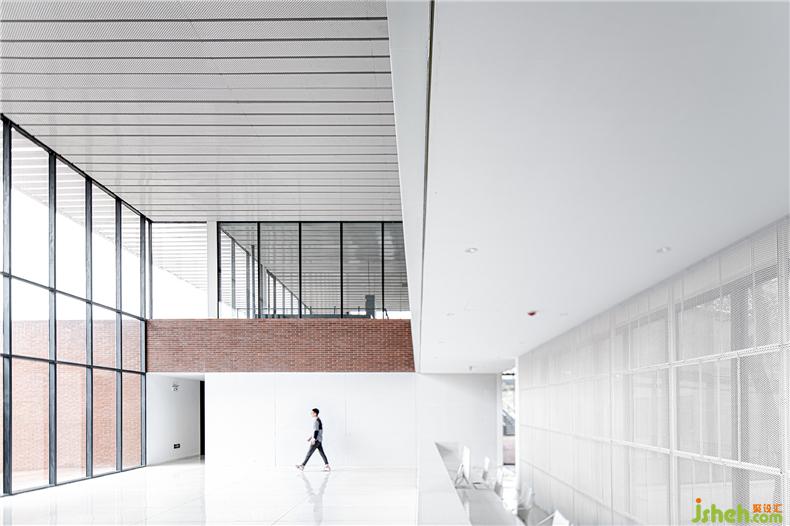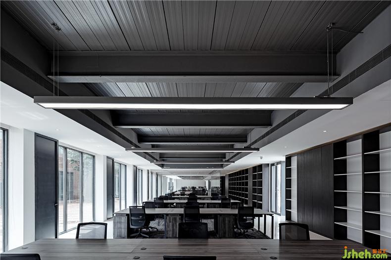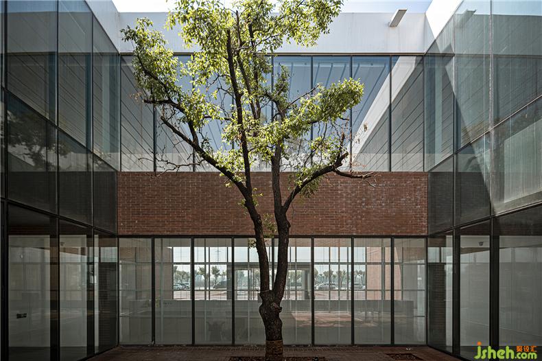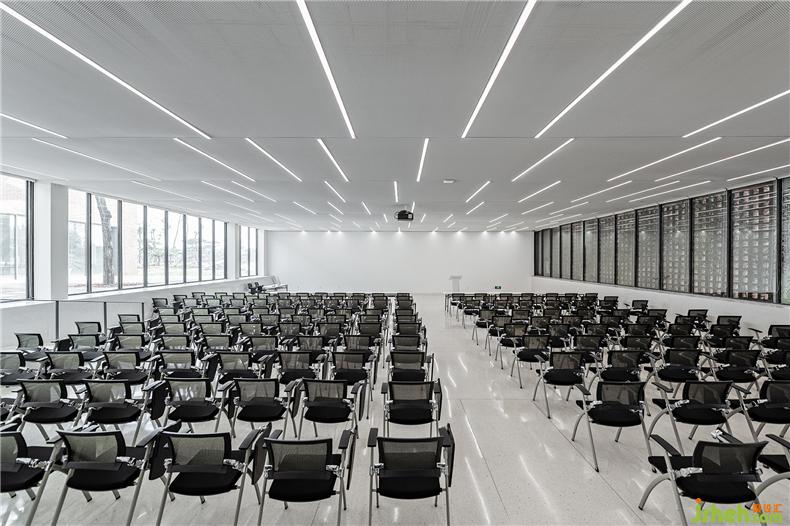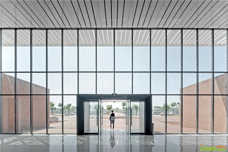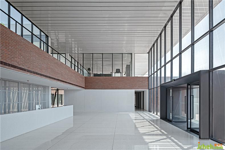 一片面積約4000平米的平屋頂+遮陽格柵覆蓋了整個(gè)建筑場(chǎng)地。辦公室設(shè)計(jì)屋頂遮陽格柵設(shè)計(jì)意象來自于周邊農(nóng)田景觀的線性肌理,并結(jié)合方格網(wǎng)結(jié)構(gòu)與平直樓板產(chǎn)生“柔化”的效果。遮陽格柵會(huì)產(chǎn)生由建筑中心向兩邊產(chǎn)生由密到疏的漸變排列,每一條格柵本身也存在著弧形的寬度漸變,同時(shí)鋁制格柵表面穿孔以弱化實(shí)體感,由此將鋼結(jié)構(gòu)屋面與遮陽系統(tǒng)結(jié)合為一個(gè)整體的大屋頂。半透明感的屋頂宛如陽光下一片巨大的燈罩,其下的建筑和庭院自然演變?yōu)楣庥暗纳帧?臻g跟隨著一天之中陽光的變化,光影的韻律交織疊合,與人的活動(dòng)一起共同演繹生動(dòng)的自然場(chǎng)景。
