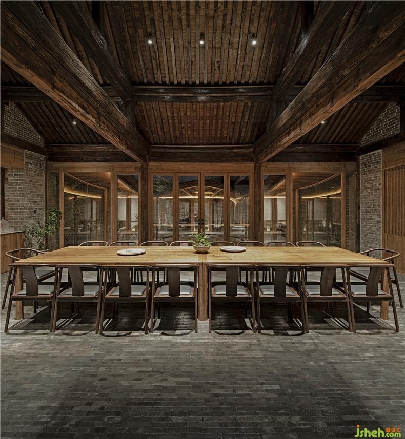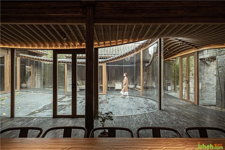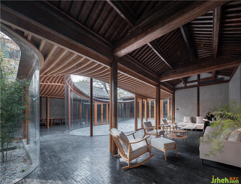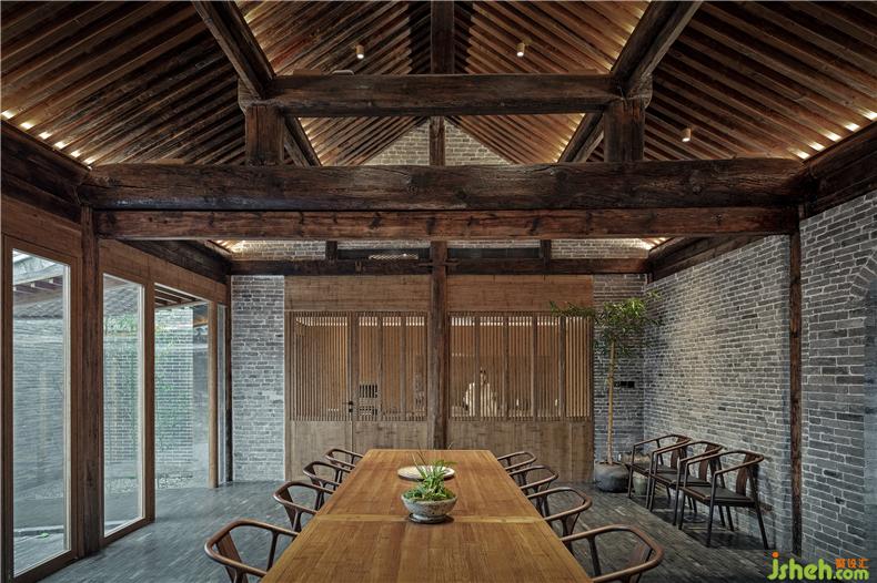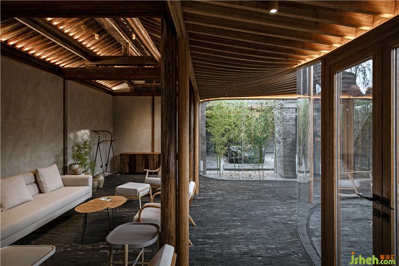 設(shè)計(jì)在保持傳統(tǒng)建筑的材料特征基礎(chǔ)上適度添加新材料,別墅裝飾注重保持時(shí)間迭代的印記,讓新與舊產(chǎn)生若干微差與疊合。原始建筑結(jié)構(gòu)整體保留,局部破損構(gòu)件依然以松木材料替換。新的游廊、門窗、部分家具使用竹鋼作為新的“木”與舊木對(duì)應(yīng)。游廊采用框架結(jié)構(gòu)支撐上設(shè)密肋梁和板,使其盡量通透輕盈融入到舊建筑環(huán)境之中。室內(nèi)還結(jié)合使用功能搭配了不同舊木、原木家具,讓不同色澤與質(zhì)感的木相互混合。傳統(tǒng)屋頂缺少現(xiàn)代防水材料,保溫性能也比較差,因此本次改造在保持原建筑灰瓦屋面不變的基礎(chǔ)上,別墅裝飾優(yōu)化了屋面做法,改善其物理性能。新的游廊屋面則采用聚合物砂漿作為曲面面層材料,用平滑的灰面與肌理的瓦頂相對(duì)應(yīng)。舊建筑墻面依然以原本院內(nèi)留下的舊磚為主材進(jìn)行修復(fù),讓此前大雜院拆除的建筑材料得以循環(huán)利用。室內(nèi)外地面也延用了這種灰磚鋪?zhàn)?,別墅裝飾保持內(nèi)外一體的效果。部分新墻面采用了透光的玻璃磚,但尺寸仍與舊建筑灰磚一致。施工過程中意外發(fā)現(xiàn)的石片、瓦罐、磨盤等,完工后將其作為景觀、臺(tái)階、花盆點(diǎn)綴于室內(nèi)外;建筑修復(fù)中作廢的木梁則被改造成為座椅。舊材料被賦予新的使用而不斷延續(xù)下去。