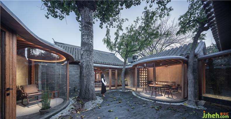 三進(jìn)院作為居住院,包括兩間臥室以及茶室、書房等空間。別墅裝飾舊建筑依然是一正兩廂的格局,院內(nèi)有三棵老樹。游廊平面在這里演變?yōu)檫B續(xù)曲線形態(tài),一方面與庭院內(nèi)的三棵樹產(chǎn)生互動(dòng),另一方面也營造出多個(gè)小尺度的弧形休閑空間。兩間臥室居于建筑最后面的房屋,室內(nèi)根據(jù)屋脊呈對(duì)稱式布局,兩個(gè)衛(wèi)生間均與小院子比鄰,實(shí)現(xiàn)良好的采光和通風(fēng)效果。