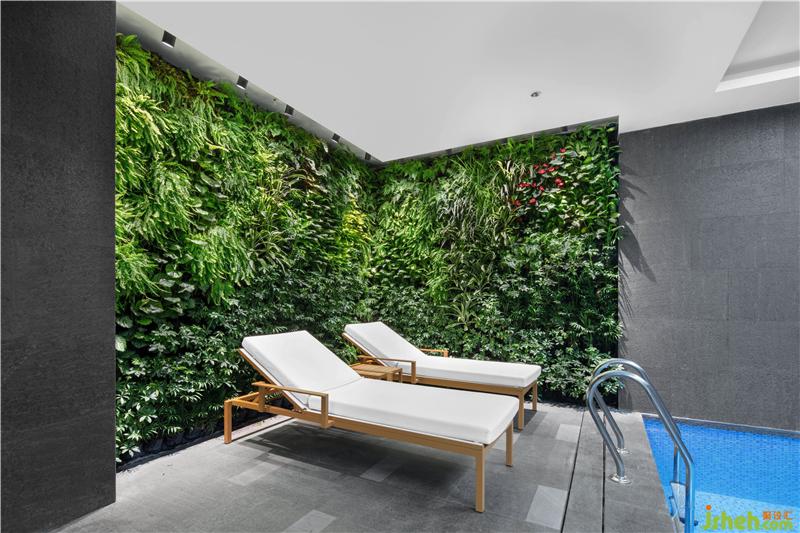 穿過兩扇玻璃飾面天地軸的大門,仿佛進(jìn)入了另一個空間。有一種峰回路轉(zhuǎn)的感覺。整個空間剛毅硬朗,體現(xiàn)了主人的品味與調(diào)性。泳池藍(lán)色的馬賽克給整個空間增添了活躍的氣氛。此空間的亮點(diǎn)是費(fèi)勁周折才得以實(shí)現(xiàn)的五個采光天窗,把天光引入室內(nèi)使空間馬上多了了一份靈動,加強(qiáng)光線在空間中的流動,日光傾瀉在清透的水面上,光影在室內(nèi)多了層溫柔濾鏡。泳池休息區(qū)墻面滿布的綠植仿佛使人與大自然有了一個親密的接觸。陽光、綠植,可見設(shè)計(jì)師的用心良苦。簡明的體塊感結(jié)構(gòu)配合暖調(diào)的鐵刀木飾面體現(xiàn)了空間的簡潔和張力?;馃疵娴暮谏呐c毛石搭配莊重而神秘,整體材質(zhì)統(tǒng)一且考慮到時(shí)間的流逝后歷久旎新。別墅裝飾