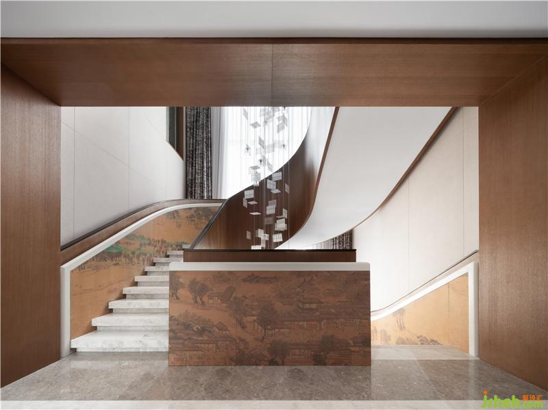 走過門廳走廊,貫穿每層空間的旋轉(zhuǎn)樓梯是整個空間的中心,也是設(shè)計(jì)的一個亮點(diǎn)。在踏步暗藏?zé)魩У囊龑?dǎo)下,踩在白色石材的臺階,仿佛踏上了白色祥云,扶搖而上。環(huán)顧側(cè)面的絹絲清明上河圖,宏偉的建筑,熱鬧的市井,人物活靈活現(xiàn)。北宋盛景盡收眼底。仿佛敘說著一段歷史延綿不斷。