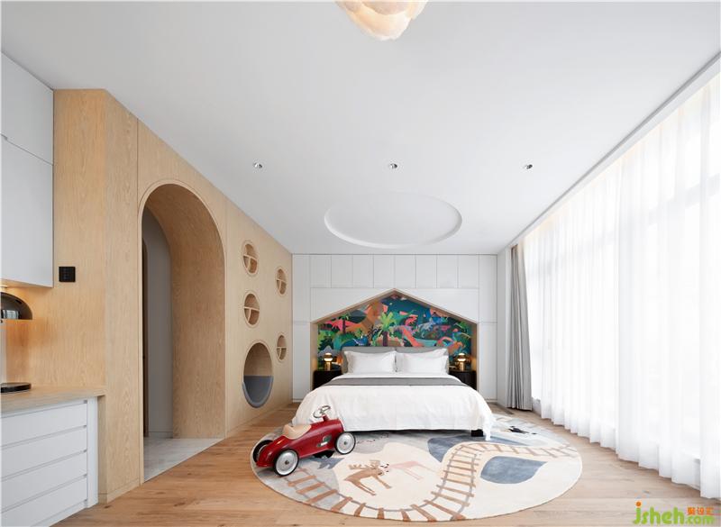 主衛(wèi)設計運用素白石材,圓形頂面張拉膜的運用,詮釋人造光下的沐浴場景,讓主人真正意義上的成為空間的主角。由于空間的頂面結構菱角錯綜復雜,設計師在設計之初結合主人的想法,增加了收納與整理區(qū)域,索性根據(jù)建筑條件新建了一層閣樓區(qū)域用來作為儲藏衣物的區(qū)域,新開了頂面的采光窗,陽光灑下天窗的一剎那,整個空間接受了自然的洗禮。