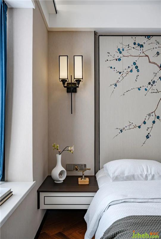 步入次臥,龍巖私宅設(shè)計床頭背景墻上,一幅梅花營造靜中之境,剔除瑣碎的裝飾,與特殊定制的床頭與邊柜形成呼應(yīng),簡潔的形式、柔和的線條,清寂的裝飾,不同材質(zhì)與肌理的碰撞,讓人不覺漫游在傳統(tǒng)與現(xiàn)代交織的藝術(shù)世界。