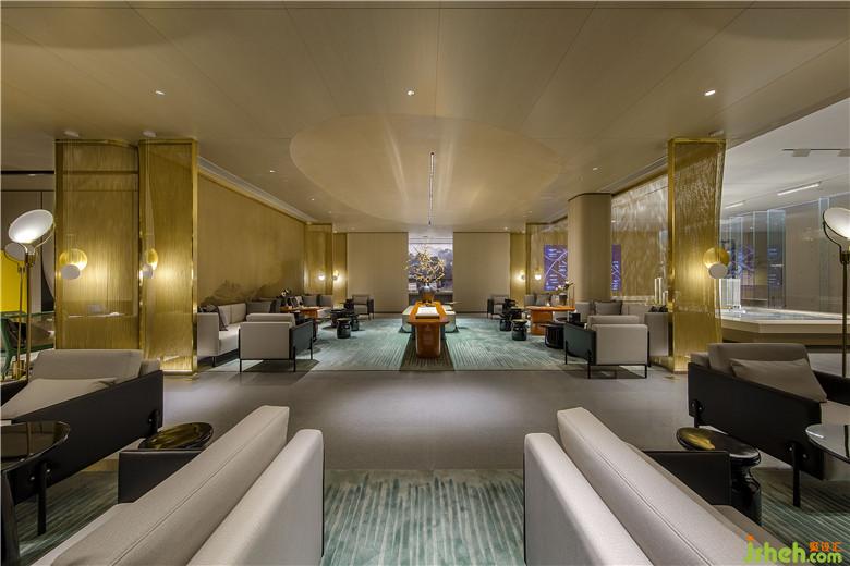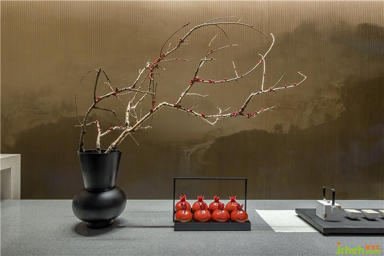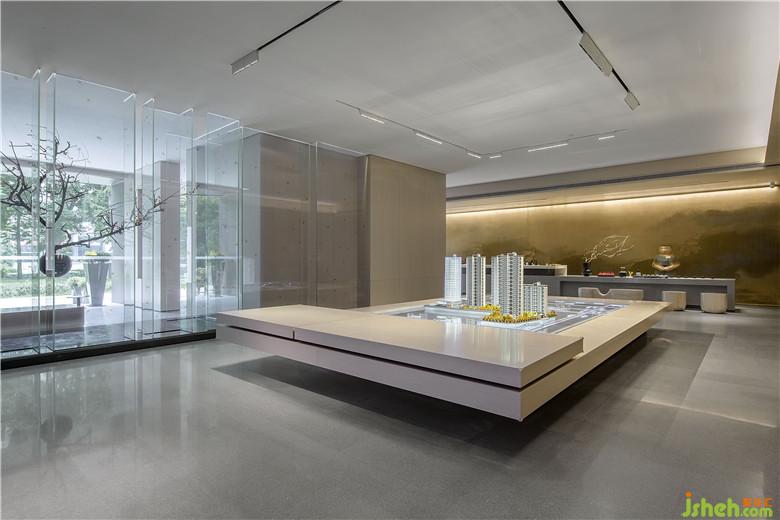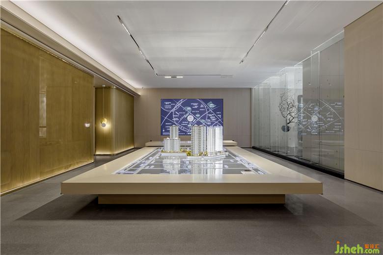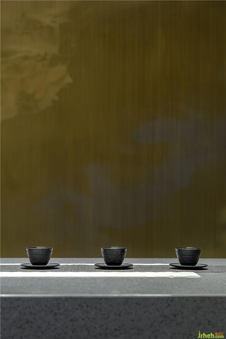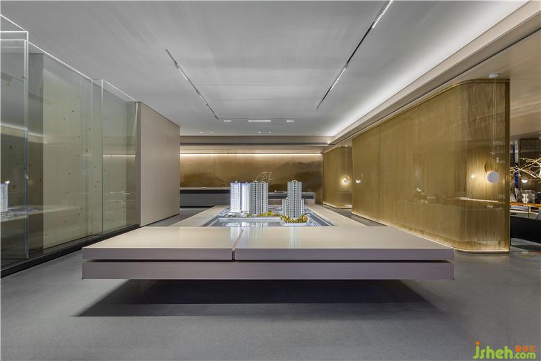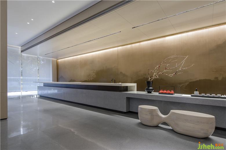 參觀者進入接待處,藉由茶臺產(chǎn)生幾分親近感,加之背景墻山水畫的貫穿,猶如品茗于山水之間,嘗一杯詩意,于空間中自得閑適。