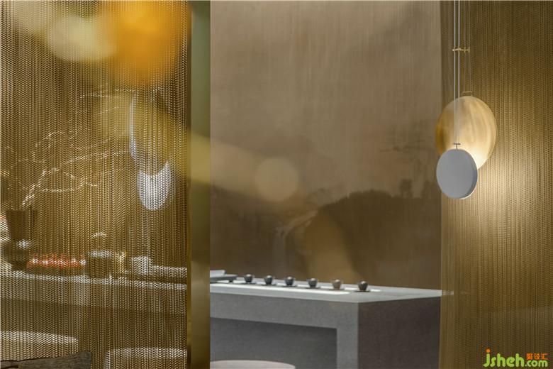 接待區(qū)與洽談區(qū)以屏風進行分割,屏風采用金屬布簾材質(zhì),形成隔而未界的效果,在視線上擴充了空間感,讓本不寬闊的空間顯得開闊通透。