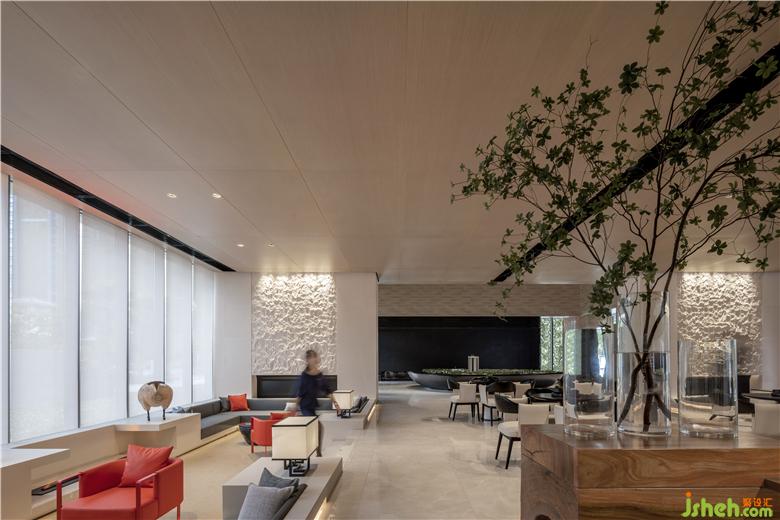 考慮到洽談區(qū)空間高度不高,設(shè)計(jì)師巧妙借用鳳城山水高低落差的巧思,將其體現(xiàn)在洽談區(qū)的空間構(gòu)造上。兩邊下沉式洽談區(qū)營(yíng)造圍合感,讓交談氛圍更輕松。同時(shí)高低落差的構(gòu)造結(jié)合落地玻璃窗,讓該區(qū)域更具空間層次,形成視覺上的趣味性。