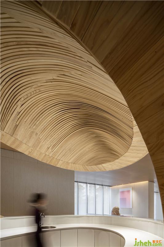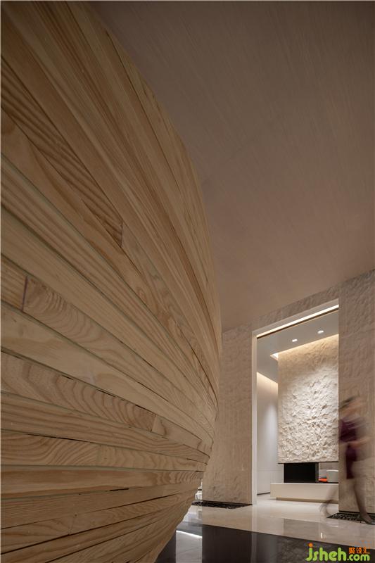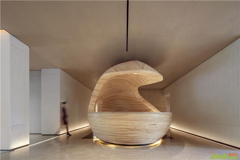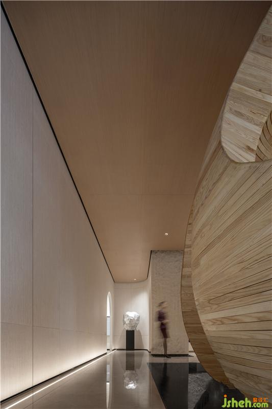 水吧區(qū)打破一般的構(gòu)造,售樓處設(shè)計(jì)將木質(zhì)材料結(jié)合鳳城奇山異石的形態(tài),將水吧臺(tái)變成空間中的藝術(shù)裝置,打造項(xiàng)目獨(dú)特的記憶符號(hào)。溫潤(rùn)的材質(zhì)與極具張力的表現(xiàn)形式結(jié)合,塑造了空間的場(chǎng)景感,體驗(yàn)別樣的空間感受。