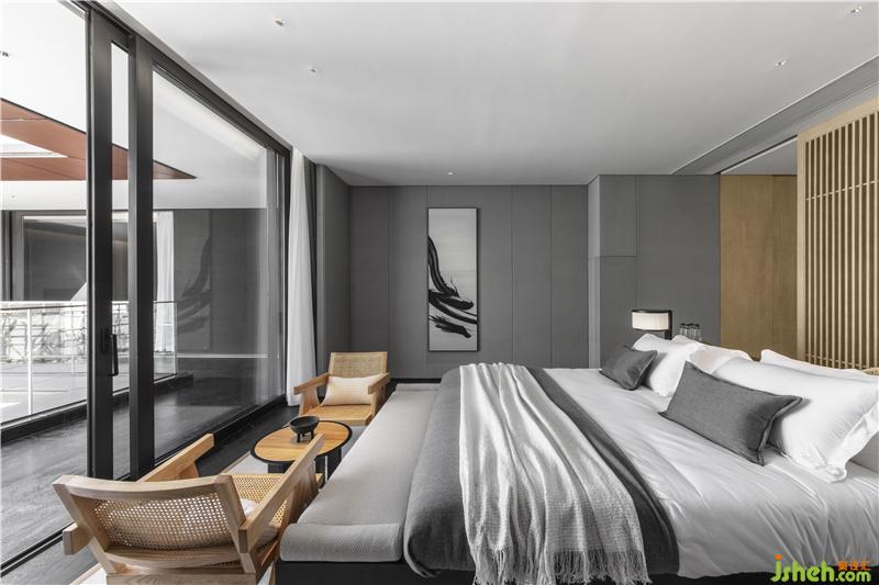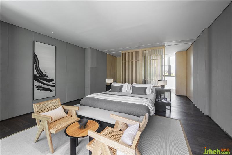 轉(zhuǎn)入二層主臥,墻壁的水墨掛畫“言有盡而意無窮”,水墨與虛白相互襯托,描繪出簡潔與空靈的意境,與空間的主題相呼應(yīng)。主臥延續(xù)了空間純粹的基調(diào),去除繁雜的設(shè)計(jì)語言,注重光與空間的互動,打造一個開闊的場域,讓心越過藩籬
