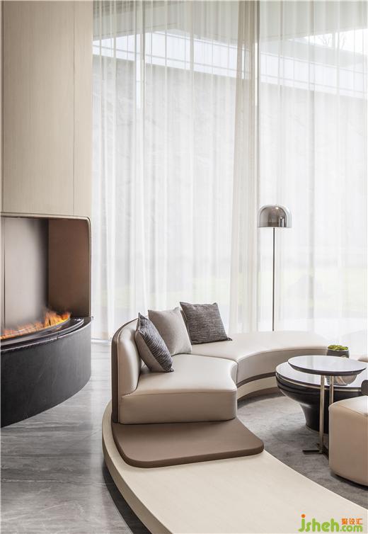 東莞卓越悅山湖花園銷售中心設(shè)計(jì)為了呈現(xiàn)空間的流動(dòng)藝術(shù)感,洽談區(qū)在圓弧的建筑漫步背景下,給予溫暖的包裹。懸浮感的沙發(fā),與落地窗外的水景,地毯呼應(yīng),似流水沖刷到腳背,宛如身處漂浮的游艇之中。