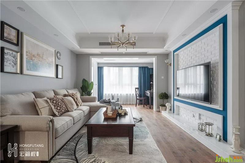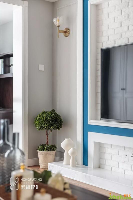 為保證足夠的開闊感,客廳以灰白棕為主色調(diào),自然干凈的灰色墻體與沉穩(wěn)安靜的木質(zhì)地板相呼應(yīng),再搭配深棕色的茶幾邊幾,色彩搭配輕重和諧,簡(jiǎn)約的同時(shí)又不失格調(diào);選擇彩色油畫作為沙發(fā)背景,緩解了視覺上的清冷;淺棕色的沙發(fā)與羽毛地毯帶來(lái)一種溫暖與浪漫的感覺;影視墻以白色磚面為主,搭配藍(lán)色線條,清新明朗,選用壁燈設(shè)計(jì),增添氛圍燈光的同時(shí),也避免了墻面的空白,精致的小擺件顯示著業(yè)主的品味和對(duì)質(zhì)樸生活的理解。