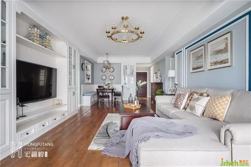 客廳空間面積較大,采用平吊頂視覺上會使得空間更高,吊頂線條細(xì)節(jié)處理使得空間更加精致;在色彩的搭配上,選用天青這樣低明度色彩使得空間耐看,更有質(zhì)感,也緩解了長期觀影的疲勞;在電視墻的處理上,同樣選用嵌入式,將電視墻整體作為一個收納空間,電視放置中間位置作為開放式展示區(qū),根據(jù)容納物件尺寸設(shè)立分區(qū),將擺件空間、中心位置、底柜空間按比例設(shè)置,擴大利用;兩側(cè)選用隔離收納柜,可作為業(yè)主書籍?dāng)[放和收藏品收納空間,采用上透明下封閉的樣式,可以緩解滿屏白色帶來的空白感和木質(zhì)收納柜的呆板。