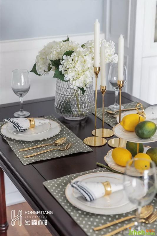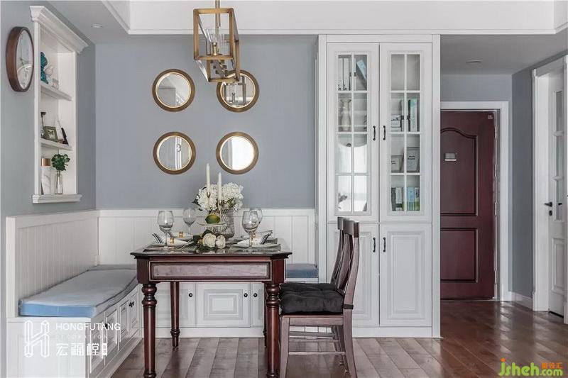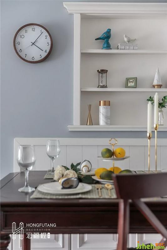 由于餐椅選用卡座形式,靠餐廳墻面剩余空間設(shè)立客廳同款收納柜,將餐廳空間最大化的運用;餐廳墻面設(shè)立嵌入式展示空間,可以擺放日常小擺件,在細(xì)節(jié)處體現(xiàn)美式的精致。
