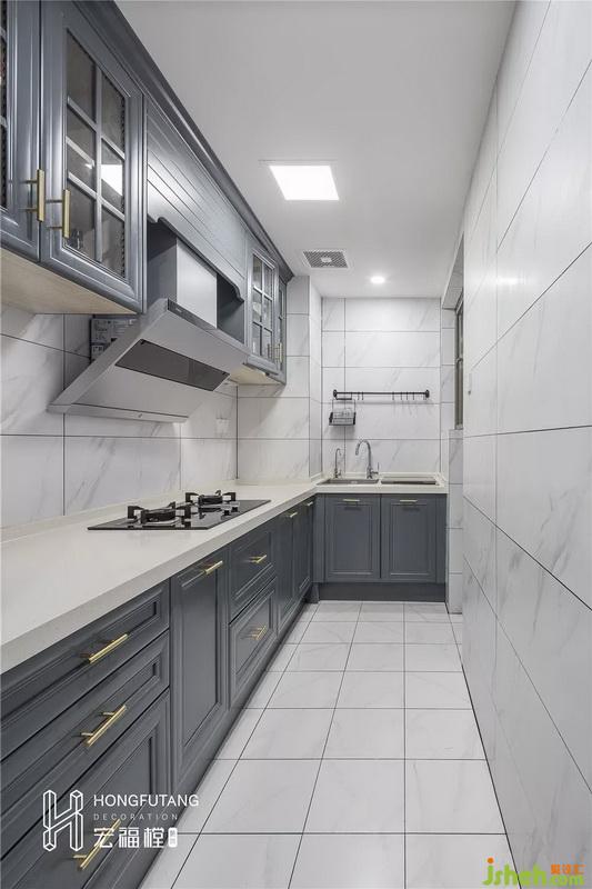 廚房空間較為狹長,根據(jù)墻體按照L型擺放櫥柜可以最大化利用空間;選用霧霾藍(lán)櫥柜搭配大理石空間,整個廚房顯得更加干凈、高級。