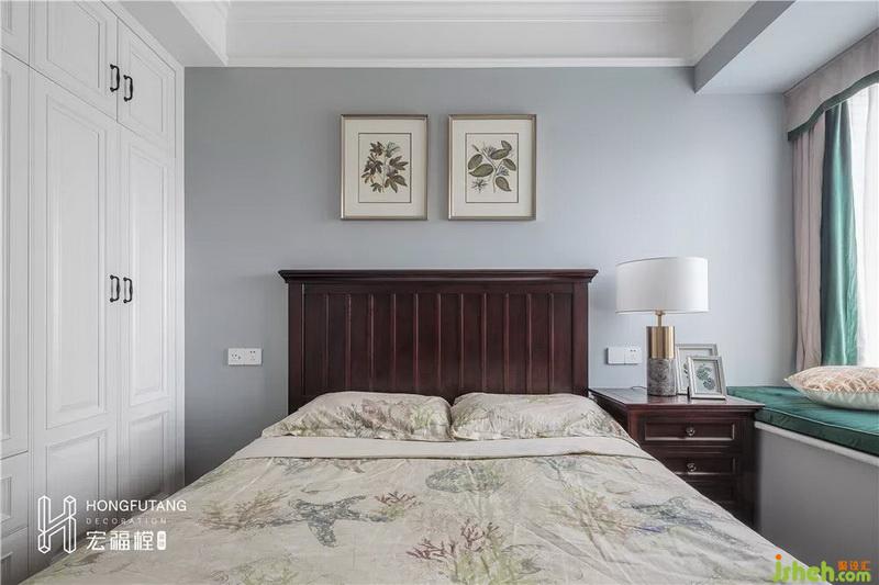 次臥室內(nèi)設(shè)計(jì)師延續(xù)主臥風(fēng)格,在空間布局上稍顯局促,所以只設(shè)立一個床頭柜;軟裝采用墨綠色,搭配棕色床頭柜,墨綠色有自然的氣息,棕色又能給人沉靜的氛圍,疲憊一天想要安眠與好夢。