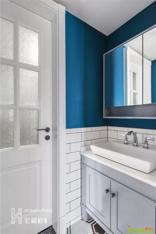 次衛(wèi)室內(nèi)設(shè)計(jì)師采用干濕分離,獨(dú)立使用,提高使用效率的同時,保證了空間的舒適度;延續(xù)空間調(diào)性,選用磚式結(jié)構(gòu)搭配水藍(lán)色墻壁,上下結(jié)構(gòu)區(qū)分,層次感更強(qiáng);選用鏡后帶柜樣式的洗漱臺,增加了可收納空間。