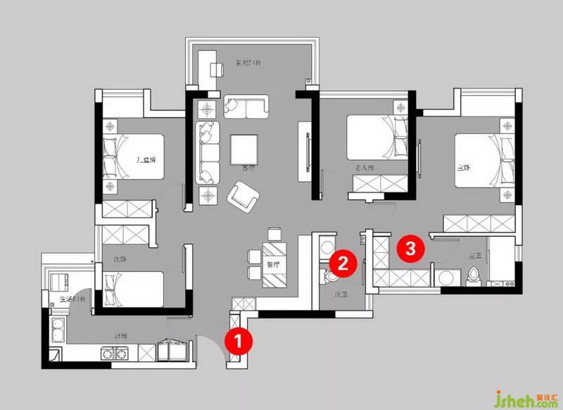 ○ 主臥拆除衣帽間墻體,做成開放式衣帽間;改變主衛(wèi)入門方向。