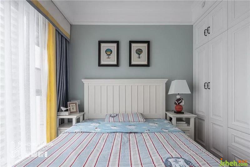 兒童房顏色相對柔和,選用白色家具,空間格調(diào)明麗,小面積黃色、藍(lán)色在窗簾處出現(xiàn),活躍了空間氛圍;擺件和壁畫使用更顯童趣。