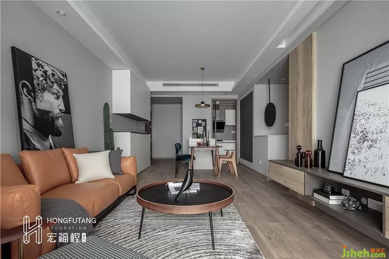 客廳空間以灰色為主,現(xiàn)代感強,空間氣質(zhì)冷冽,搭配皮質(zhì)三人沙發(fā)提高空間質(zhì)感;客廳空間顏色單薄,在不打破原有和諧色彩的情況下,選用千鳥格單人椅豐富視覺;客廳空間有限,選擇圓形茶幾減少對客廳空間占用的同時,方圓均衡,體現(xiàn)一種簡約的和諧感;電視柜選用懸空設(shè)計,減少滿柜的呆板,木色與灰色搭配,層次感更強,將電視墻插頭都放在開放式柜中,日后放置電視盒更為方便,也在視覺上遮丑;在客廳陽臺位置設(shè)立壁柜,合理利用空間,最大限度擴大公共收納空間;客廳采光充裕,選用無主燈設(shè)計。