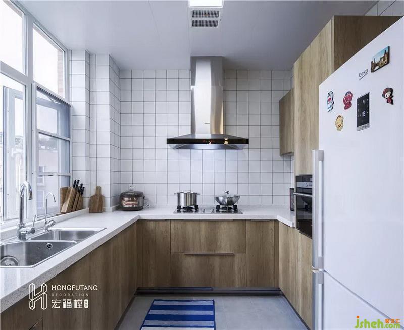 廚房進門方向由西面改至北面,進門方向的變動,解決了櫥柜地柜的操作問題,提高了廚房空間利用率,與餐廳之間劃分了更為合理的動線,也為公共衛(wèi)生間洗漱池的增設預留了位置;這個改造利于三個空間和諧布局,劃分更加合理。