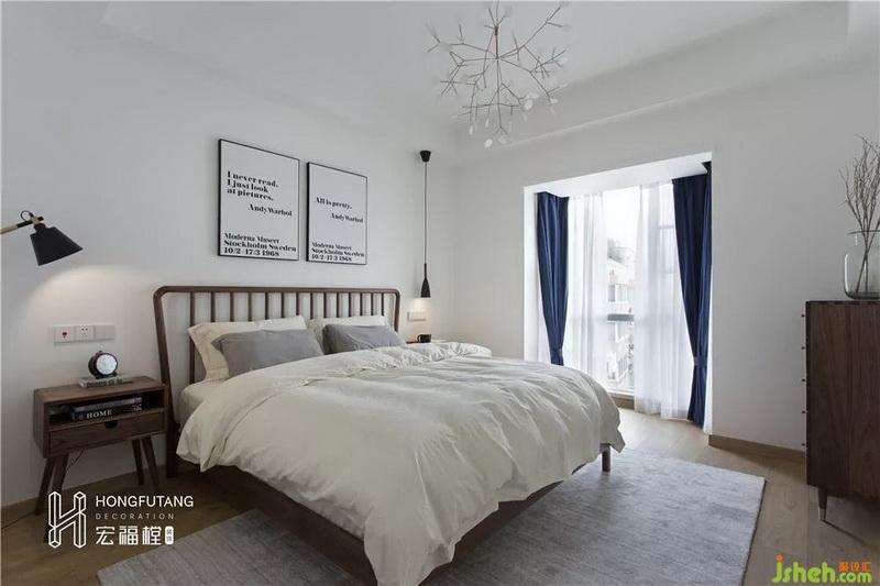 主臥空間以簡(jiǎn)約為主,灰黑白三色搭配木色出現(xiàn),選用藍(lán)色作為軟裝色彩,更加親近自然,由于主臥空間本身有很大的衣帽間,所以在主臥內(nèi)只設(shè)立了斗柜作為日常收納和物品擺件使用。