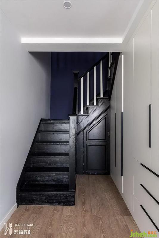 原本玄關布局散亂,不利于鞋柜擺放,浪費了樓梯及客廳的交界處空間。在利用樓梯空間時,將鐵質(zhì)樓梯拆掉換成木質(zhì)樓梯,用背靠背的兩組柜子隔離入戶和樓梯空間,面向入戶處作為玄關的鞋柜和儲物柜使用,面向樓梯處作為整個家里公共區(qū)域的儲藏柜使用,保證兩個空間獨立的同時,也增加了整個房屋的公共收納空間,同時還可將樓梯下面的空間利用起來作為小的雜物間使用。