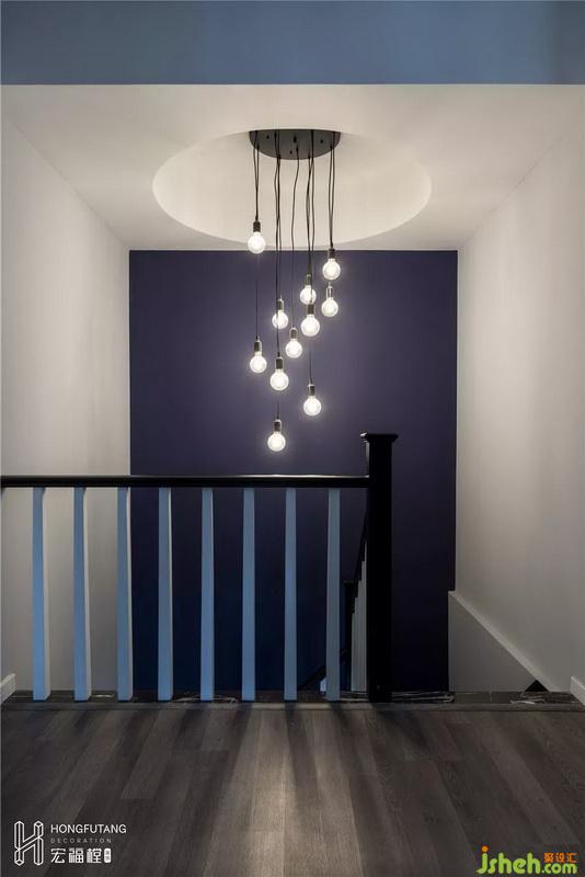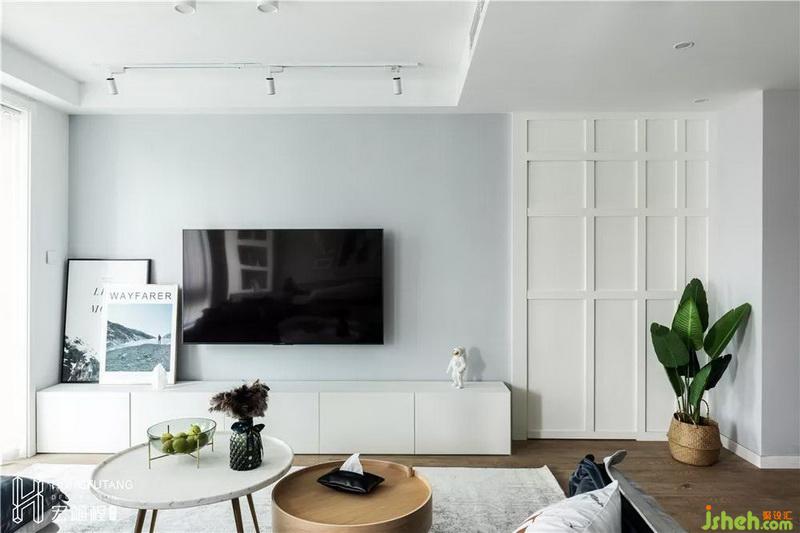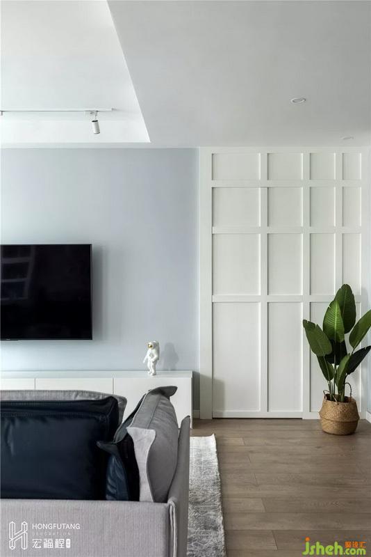 客廳家具主要以白色為主,選用原木地板搭配灰色,空間質(zhì)感精致簡潔,符合業(yè)主最初的要求;由于客廳本身采光好,在光源設計上,無主燈設計,減少燈具帶來的壓迫感。