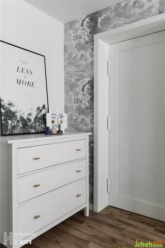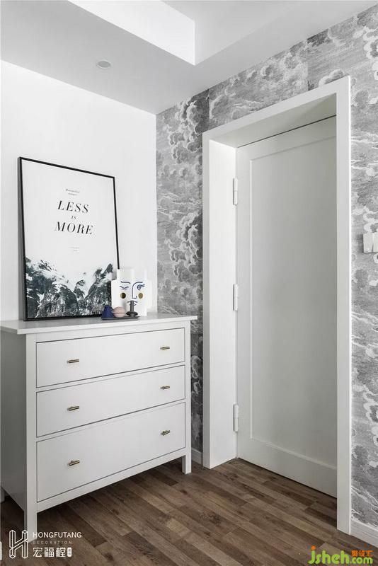 老人房位于客廳背后,將原有儲藏室與老人房合并,擴(kuò)大到15.5㎡,將原有的儲藏間的位置改造成開放式的衣帽間,因?yàn)閮Σ亻g部分墻體是承重墻體,加之強(qiáng)電箱的位置也在墻體上,所以利用原有墻體的位置與新門洞隔墻的位置打造小景觀區(qū),放置斗柜,方便收納。