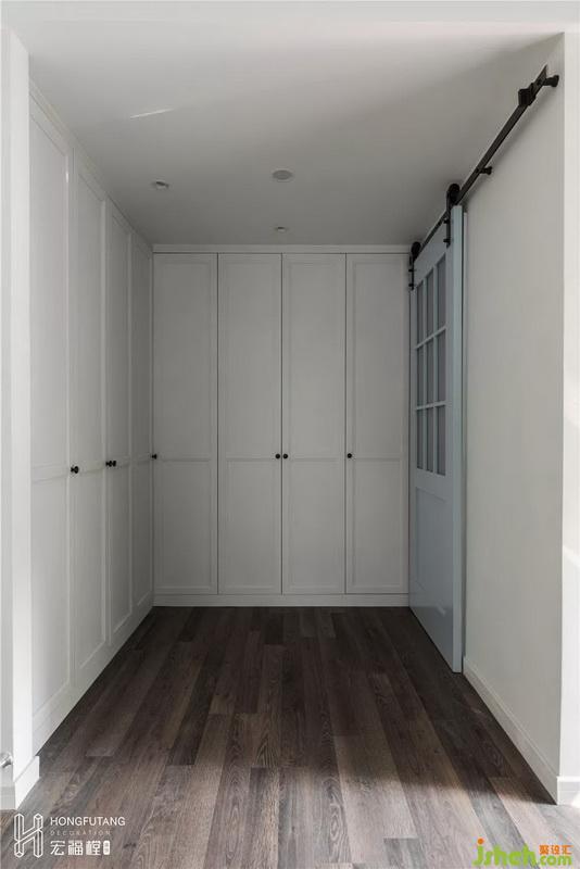 主臥衣帽間呈L型,靠兩面墻做收納空間,盡可能擴(kuò)大衣帽間的同時(shí)也與休憩空間互不打擾。