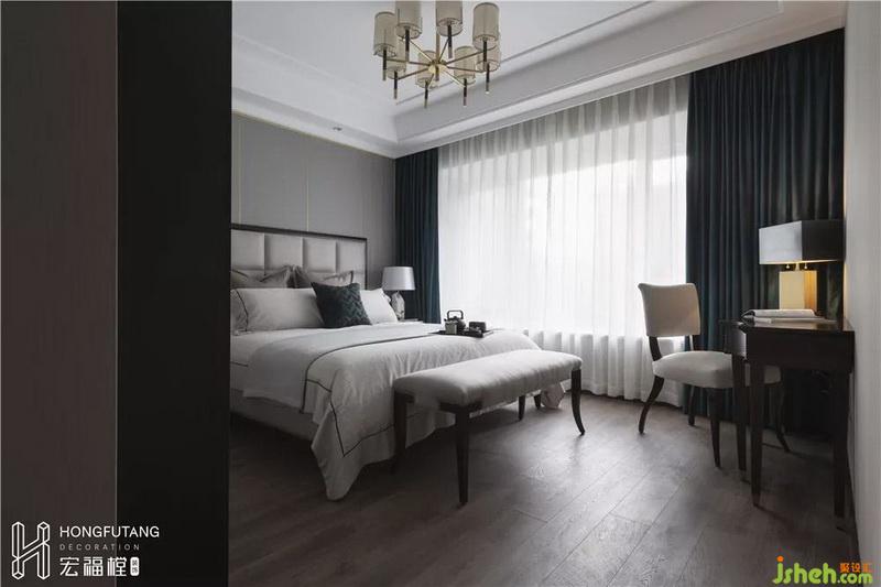 床尾放置橫凳,可以用于日常就坐、擱置日常衣物;窗邊設立書桌,可用作不正式辦公和閱讀區(qū)域。