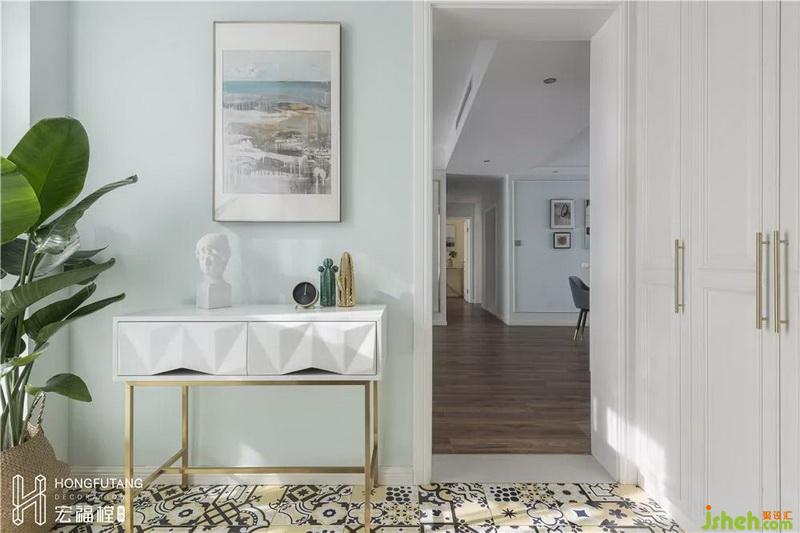 門廳空間為異形空間,空間面積充足,所以在右側(cè)依墻形狀設(shè)立收納柜,可作為鞋柜、進(jìn)出換裝、收納空間使用,進(jìn)門正對放置抽屜小桌可隨手放置背包和鑰匙物件。