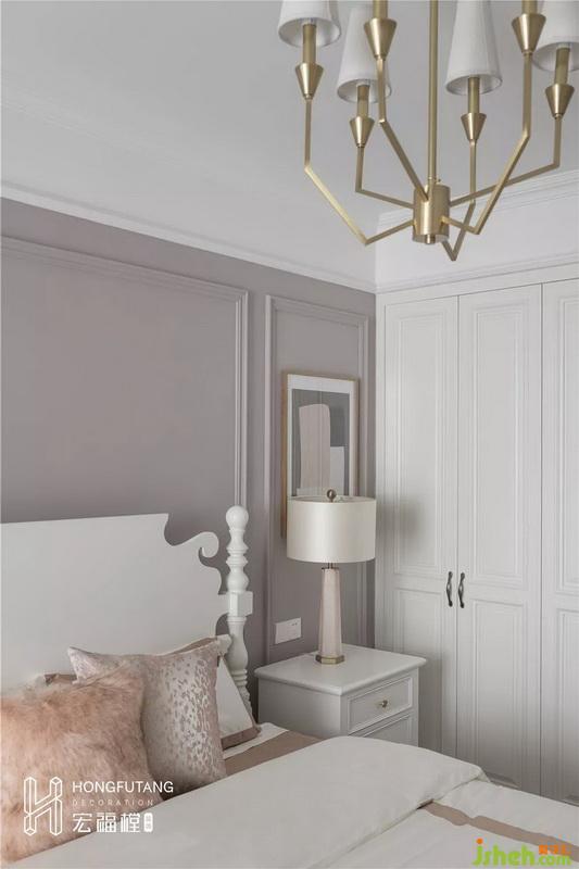 為滿足女兒的少女心,所以女兒房的色調(diào)偏粉嫩系,在選用粉色時,考慮到明度太高的粉色隨著女兒的成長會顯得過于幼稚,綜合整個空間風(fēng)格,選用灰粉色,降低了空間色彩明度,中和了整個空間色調(diào)和少女心事;家具和軟裝搭配上選用公主床,少女氛圍濃烈。