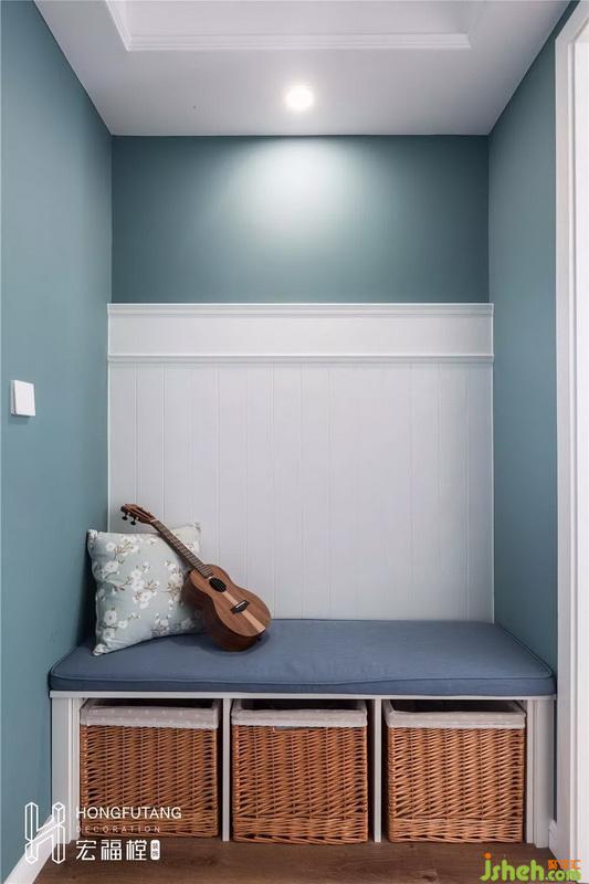 入戶(hù)空間相對(duì)獨(dú)立,在入戶(hù)門(mén)廳增添?yè)Q鞋掛衣區(qū),便于空間收納,靠墻位置用白色木板,減少墻體接觸的污染,也綜合局部的深灰綠,讓人有一回到家便放松下來(lái)的歸屬感。