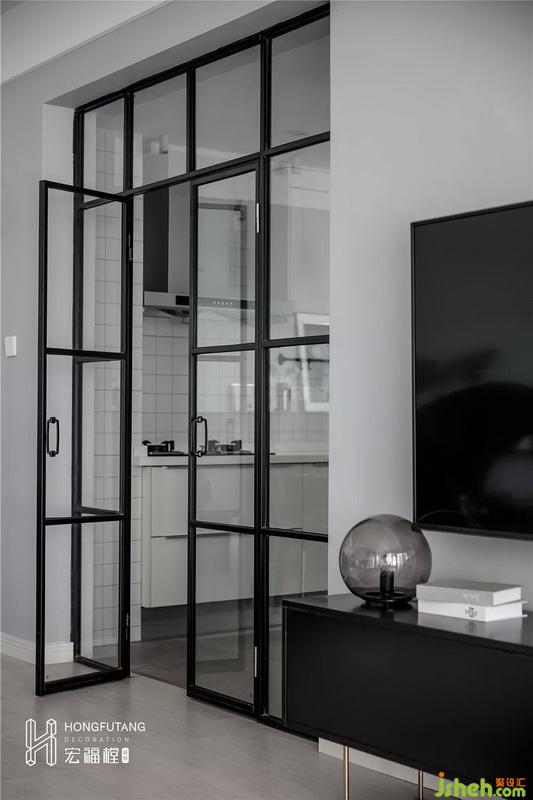 廚房本身較小,無法容納下雙開冰箱,所以將廚房與衛(wèi)生間墻壁拆除,將原本洗手臺位置用來放置冰箱;廚房門與電視墻在同一個墻體上,電視墻門面過多,加之為了改進廚房采光,廚房門換成黑框玻璃門樣式,豐富了電視墻面,增添了廚房光亮,改后擴大了內(nèi)外的視覺空間,并且從豎向面上達到了分區(qū)的作用。