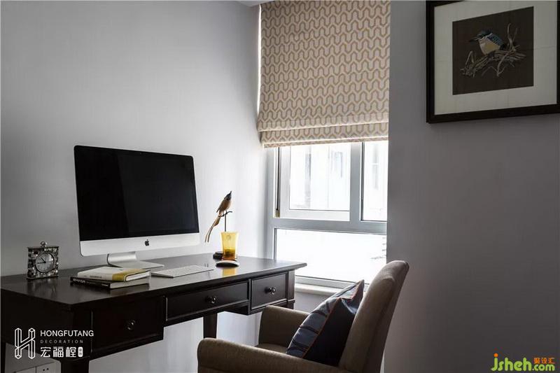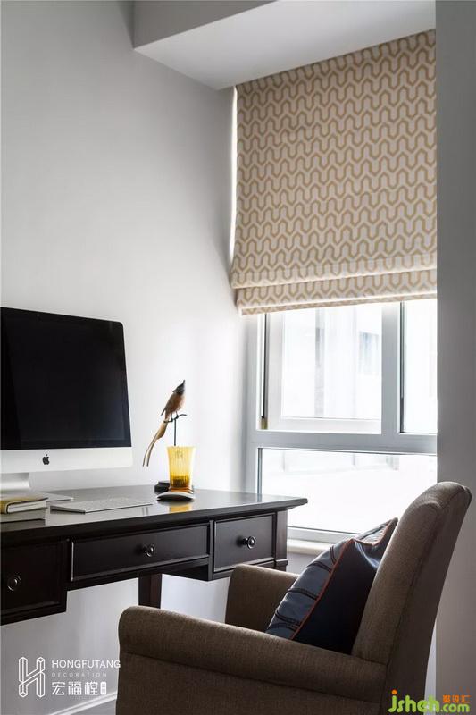 書桌靠近窗邊陳列,利于辦公采光。考慮到日后要將書房改造為兒童房使用,目前書房采用活動(dòng)家具,便于移動(dòng)更替。