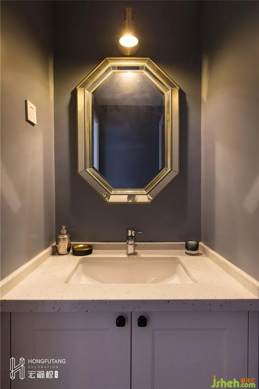 干區(qū)空間面積壓縮,所以在設(shè)計(jì)時(shí)以簡潔為主,不需要設(shè)立太多裝飾,帶有柜子的洗手臺(tái)就能解決大部分收納問題,也使得干區(qū)空間整潔有條理;選用六邊形鏡子,使得小空間更加靈動(dòng)不壓抑。