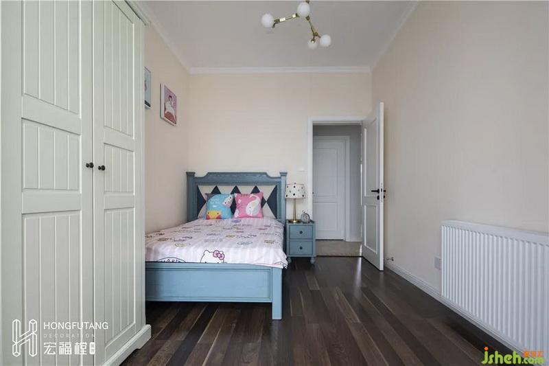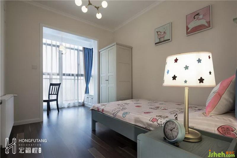 兒童房形狀偏長(zhǎng),門(mén)開(kāi)在右側(cè)邊角,所以將床往左靠墻擺放,進(jìn)門(mén)視線更開(kāi)闊,選用粉藍(lán)粉紅滿(mǎn)足女兒的童話公主夢(mèng);選用活動(dòng)家具,左側(cè)書(shū)桌,右側(cè)矮柜,動(dòng)線更流暢,便于小朋友活動(dòng),視野更加開(kāi)闊,也便于日后移動(dòng)更替。
