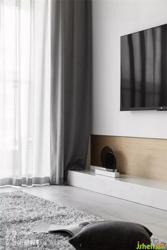 業(yè)主想有一個戶外活動空間,休閑陽臺依然保留??蛷d空間有限,所以沒有采用茶幾,用地毯和沙發(fā)延伸客廳空間,地毯的使用使得冰冷的地板有了溫暖,可容納業(yè)主二人平時看電視,打游戲,在朋友來時,也可直接席地而坐,減少多余凳子對空間占用;電視墻選用白色墻壁搭配木色底板,本身整個客廳選用白色墻壁,顏色單薄,搭配木色包邊做成凹凸?fàn)?,使得空間層次感更強;選用底臺設(shè)計,減少電視柜對空間的占用,視覺上空間更加干凈;沙發(fā)墻選用大篇幅的深藍(lán)色系畫作,統(tǒng)一空間色系,也避免了墻面的空白感.