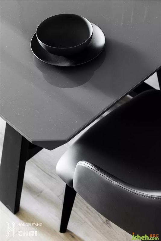 餐廳選用深灰家具搭配左側(cè)青灰墻面,灰色的運(yùn)用提高了餐廳空間質(zhì)感,現(xiàn)代感更加強(qiáng)烈。餐桌對(duì)面設(shè)計(jì)懸空掛式壁柜,上方可作為陳列區(qū)和小家電使用區(qū),左邊封閉柜子作為收納區(qū),右邊兩格作為酒具放置區(qū),采用這樣半封閉的樣式,避免了視覺呆板。
