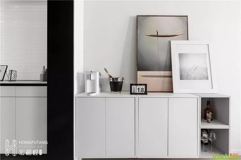 書房飄窗加寬,采用榻榻米形式,右側(cè)設(shè)立半封閉收納柜,可作為擺件的放置區(qū),榻榻米下方也有足夠的收納空間放置不常用物品,使得空間更加整潔;榻榻米的采用一是可作為業(yè)主偶爾工作放松區(qū)域、閱讀區(qū),二是可以用作客人留宿使用。