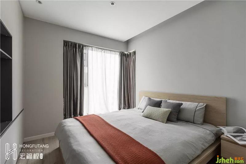 主臥空間低調(diào)柔和的配色與木質(zhì)家具,營(yíng)造休息空間的簡(jiǎn)凈高尚。無色調(diào)的空間搭配有色調(diào)的姜橙色床毯,打破了空間的單調(diào)感,為主臥增添了更多的溫馨舒適感。