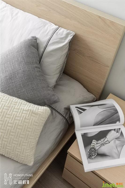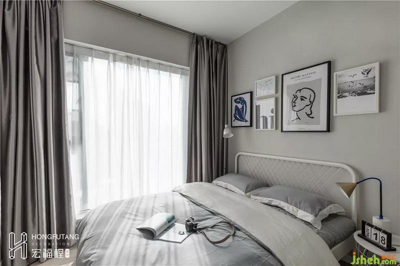 采用系列壁畫豐富床頭墻面的同時(shí),也在色調(diào)上保持統(tǒng)一,打造冷靜空間氛圍。