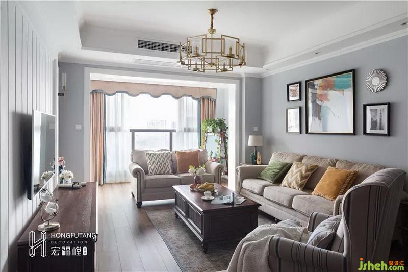 美式客廳風格簡潔明快,色彩明艷亮麗,所以在色彩搭配上,家具選用沉穩(wěn)的棕色搭配白色,用黃綠粉等軟裝來調(diào)節(jié)空間的明亮度。