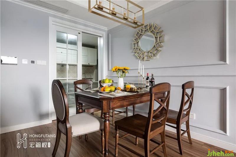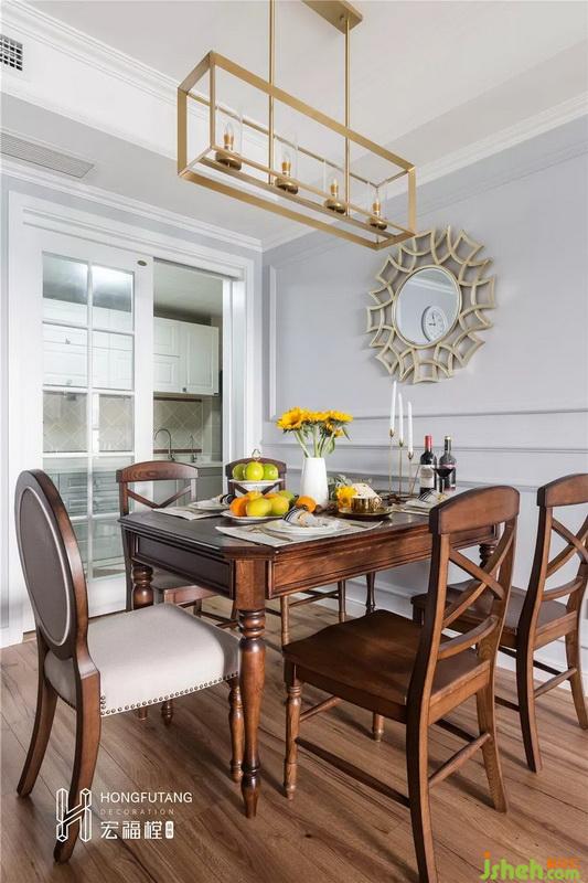 餐廳墻壁選用線條打造空間層次感,用金色復古壁鏡裝飾,將美式的華麗從細節(jié)處顯露出,用細節(jié)打造空間的精致感。