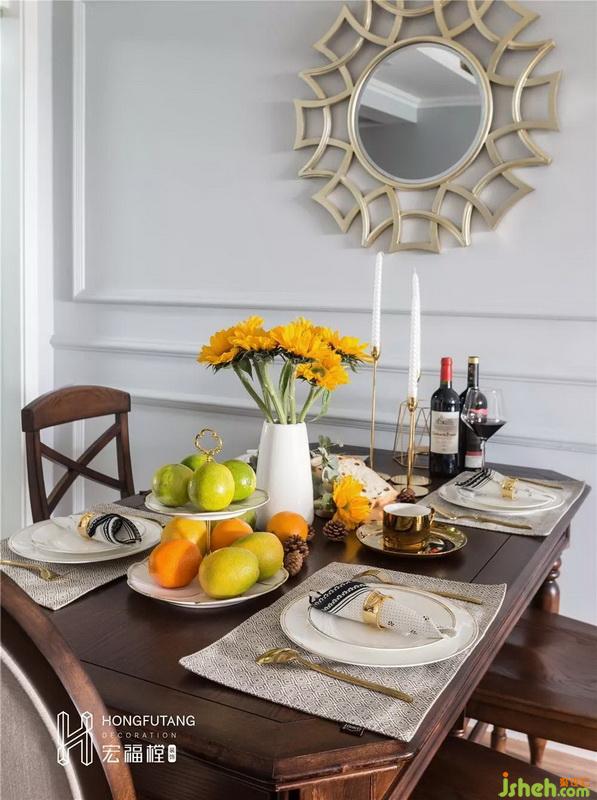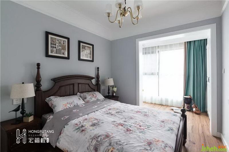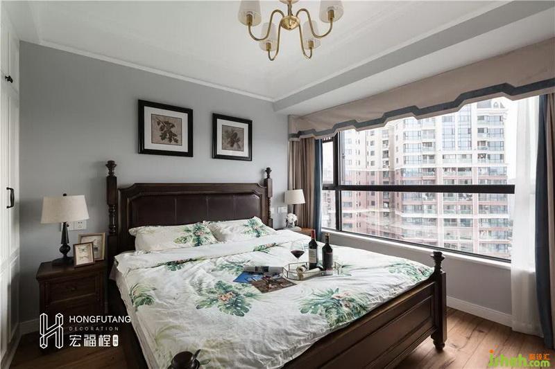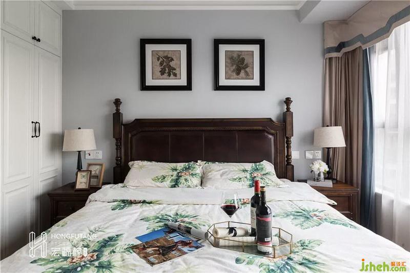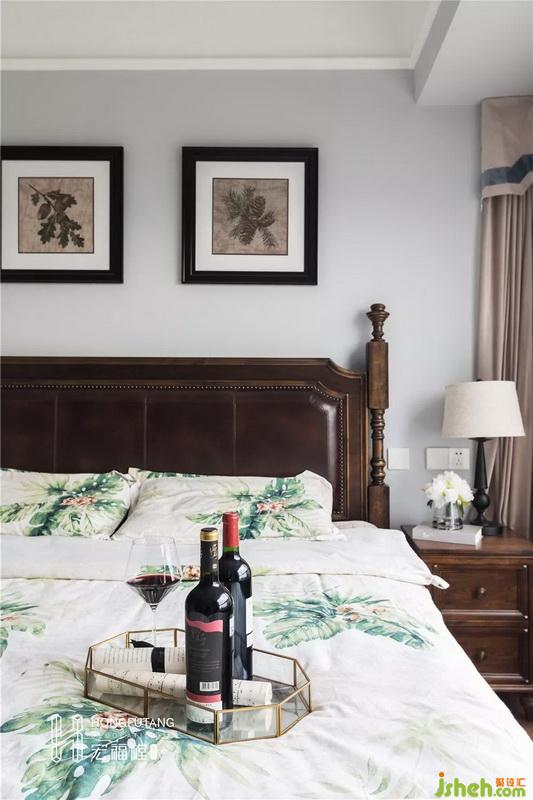 選用硬挺的皮質(zhì)床頭,皮質(zhì)床頭符合人體舒適感知度,又不會在視覺上顯得過于松散,契合美式風(fēng)格的優(yōu)雅;選用兩幅深色系掛畫豐富床頭上方空白墻壁,與整個房間色調(diào)一致;在衣柜顏色選用上,為避免整個臥室空間氛圍太過壓抑,選用白色衣柜配合深色家具搭配。