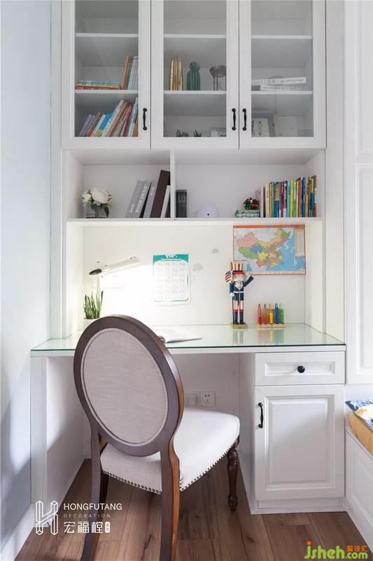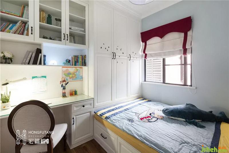 兒童房選用一體式家具,利用家具的自然線條,室內(nèi)設(shè)計(jì)師將每個功能區(qū)進(jìn)行明確的分隔。床的形式采用榻榻米樣式,一是榻榻米作為床使用可以節(jié)約空間,二是利用榻榻米靠墻空間和榻榻米下方作為收納區(qū),可收納不常用大件物品。左側(cè)上方做成書籍收納區(qū)和擺件展示區(qū),下方設(shè)立書桌,可滿足小朋友學(xué)習(xí)的需求。