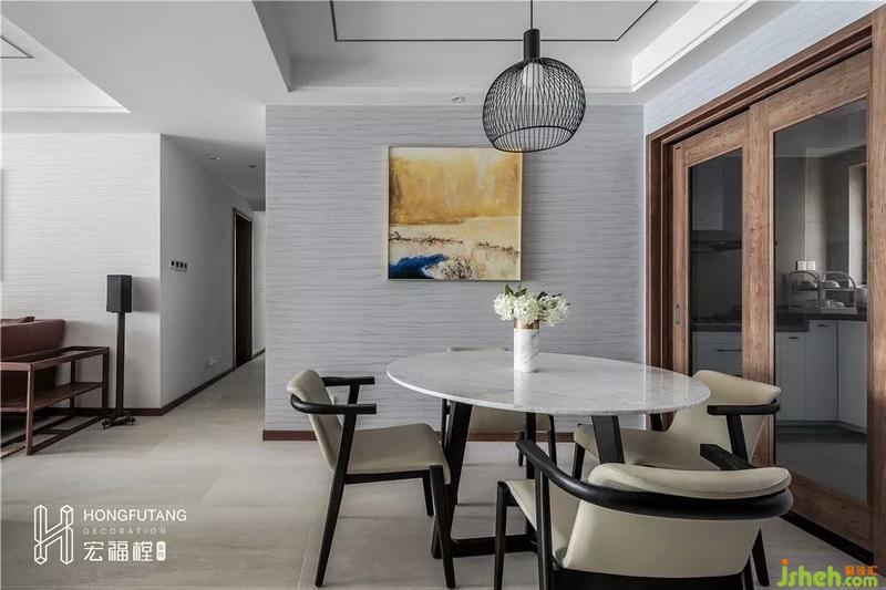 考慮到家中常駐人數,選用四人圓桌,不占用太多空間同時,大理石材質和顏色更符合整個空間風格;餐廳墻面選用灰色條紋,為增添餐廳活力,選用暖色系掛畫改善冷淡的用餐空間。